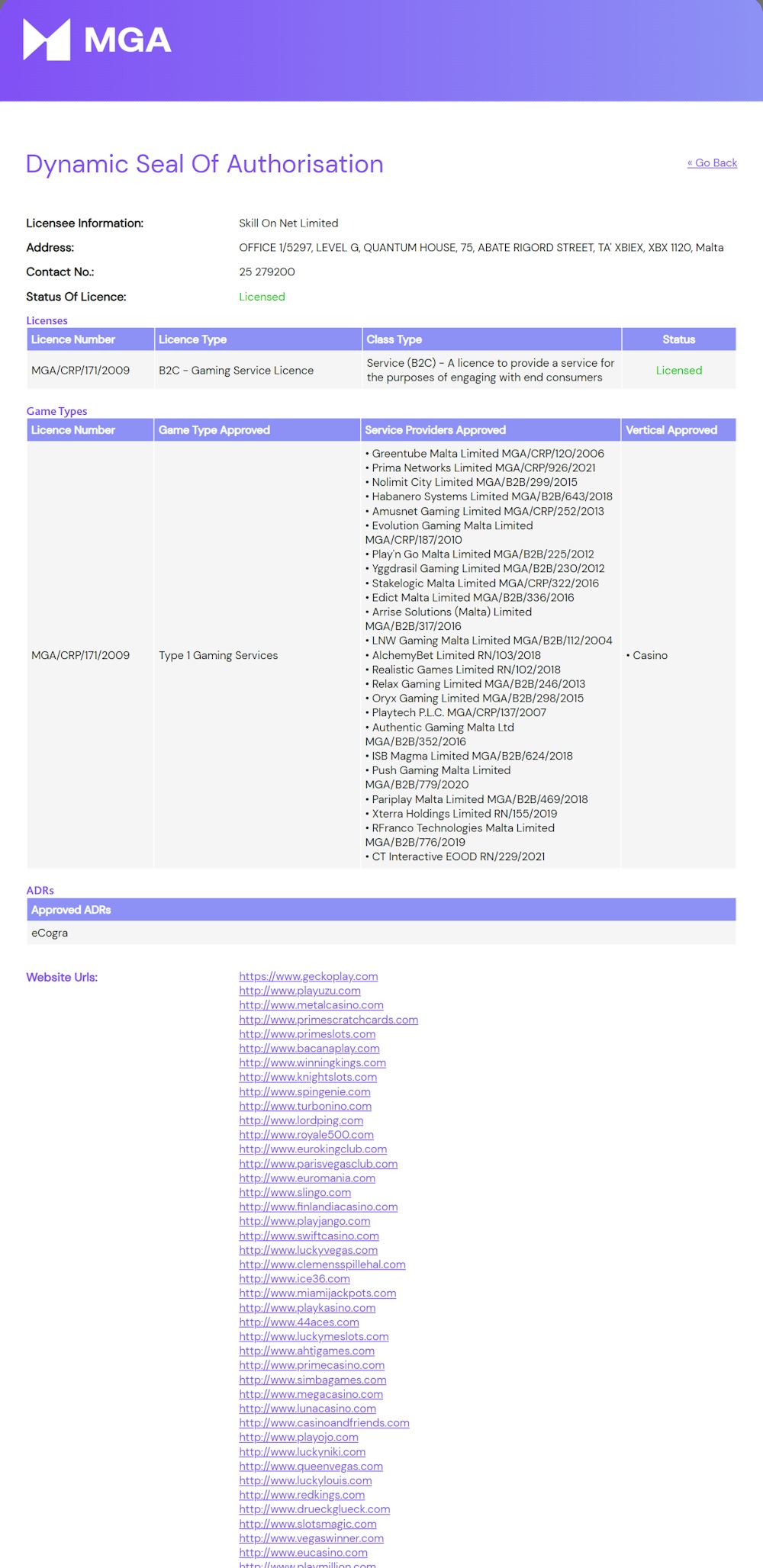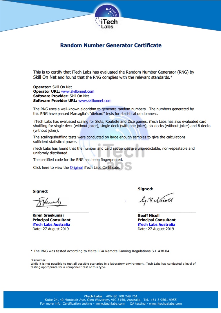 Below you can see the Skill On Net's MGA licence and the LuckyNiki domain in the valid certification. All the details are verified, meaning LuckyNiki is truly licensed by the Malta Gaming Authority.