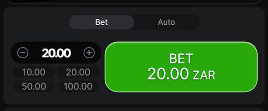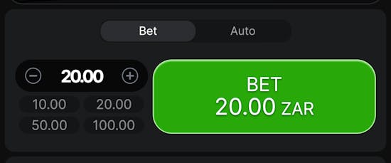 First of all, set your bet amount. You can stake from R2 to R1,800 on a single bet. There are presets of R10, 20, 50, and 100, and you can also change amounts by clicking the minus plus icons.