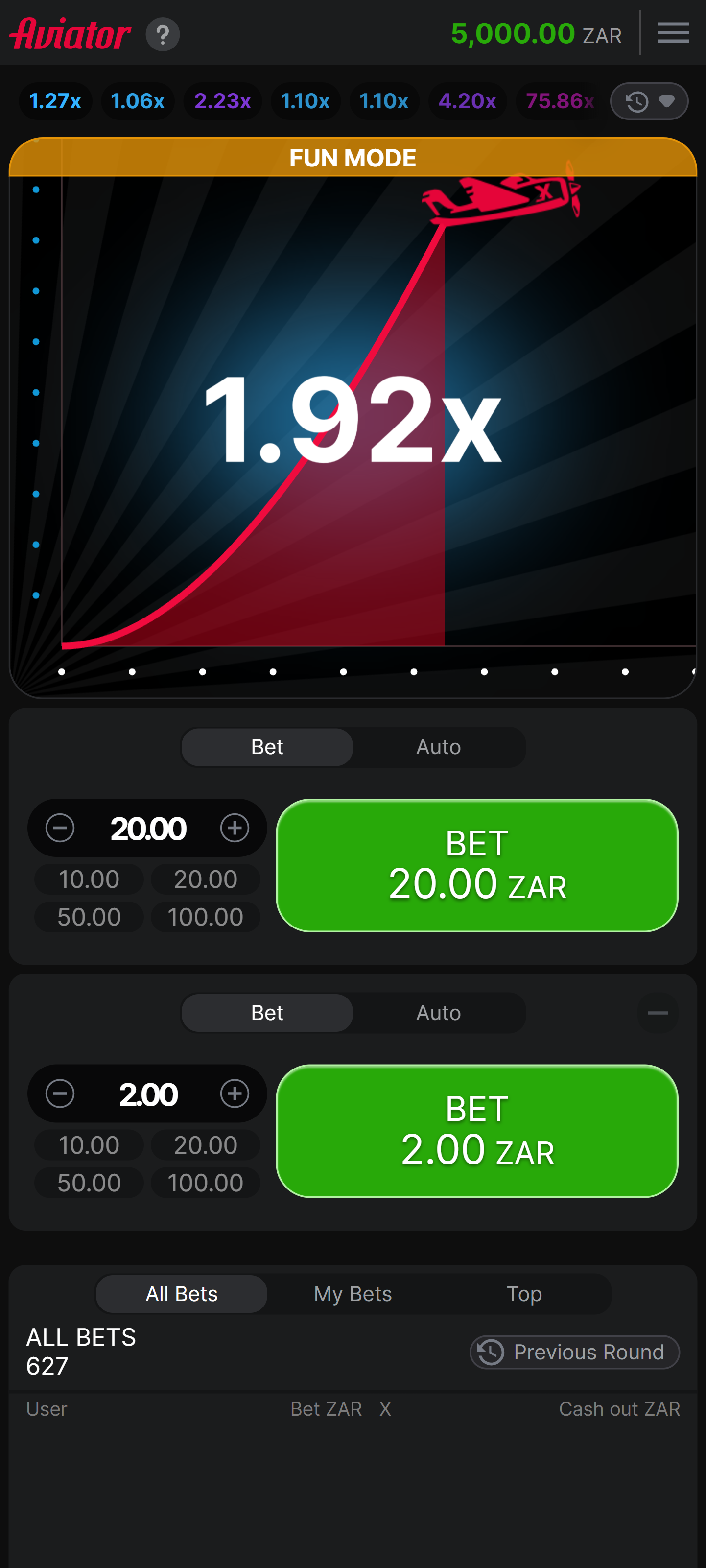 First of all, set your bet amount. You can stake from R2 to R1,800 on a single bet. There are presets of R10, 20, 50, and 100, and you can also change amounts by clicking the minus plus icons.