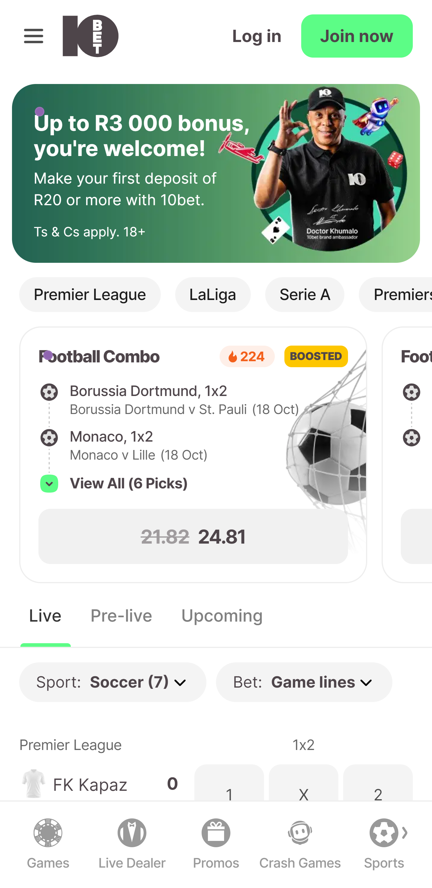 10bet offers a range of casino games, such as online slots, table games, and crash games in the 'Games' section. You can also find popular live casino games in the 'Live Dealer' section, where you can interact with real dealers in-game. Although 10bet South Africa does not specifically market itself as a casino site, we believe this rich collection of games positions it as one of the top online casino sites in South Africa in 2025.